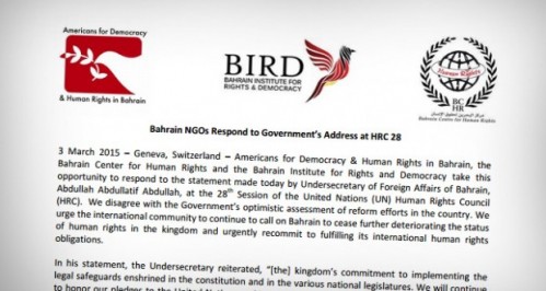 وقالت منظمات (أميركيون من أجل الديمقراطية وحقوق الإنسان في البحرين، ومركز البحرين لحقوق الإنسان ومعهد البحرين للحقوق والديمقراطية "بيرد") في بيان مشترك لها بالعاصمة السويسرية جنيف رداً على مزاعم السلطات البحرينية أمام مجلس حقوق الإنسان، إنها تختلف مع "تقييم الحكومة ونحث المجتمع الدولي على مواصلة دعوة البحرين لوقف المزيد من تدهور وضع حقوق الإنسان في المملكة وإلزامها على وجه السرعة إلى الوفاء بالتزاماتها الدولية في مجال حقوق الإنسان".