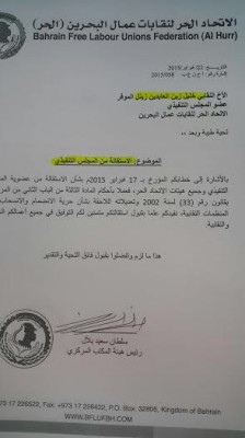 أما الاتحاد الحر فقد اكتفى بالرد على رسالته بخطاب في 22 فبراير/شباط 2015 موقع من رئيس هيئة المكتب المركزي "سلطان سعيد بلال" جاء فيه إنه "بناءً على المادة الثانية من الباب الثاني من المرسوم بقانون رقم 33 لسنة 2002 بشأن حرية الانضمام والانسحاب من المنظمات النقابية، نفيدكم علماً بقبول استقالتكم متمنين لكم التوفيق في جميع أعمالكم المهنية والنقابية".