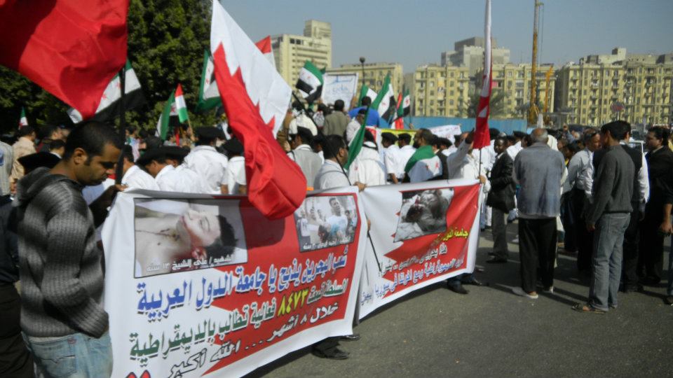 وكان عدد من نشطاء الثورات في البحرين وسوريا واليمن قد نظموا وقفة مشتركة السبت أمام مبنى الجامعة العربية بالقاهرة. ورفعوا شعارات تطالب الجامعة بالتدخل من أجل الضغط على الدول الأعضاء للقيام بإصلاحات ووقف انتهاكات حقوق الإنسان. ورفضت الجامعة في البدء تسلم رسالة المعارضة البحرينية قبل أن تعود أمس وتوافق على تسلمها.