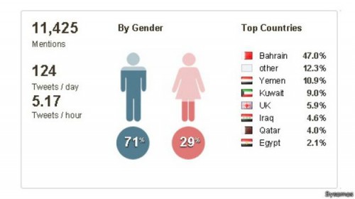 وأضاف موقع بي بي سي إن هاشتاغ "#العدوان_السعودي" و هاشتاغ "#لا_للعدوان_على_اليمن" احتلّا قائمة الهاشتاغات الأكثر تداولا في البحرين، ليصل بذلك العدد الإجمالي للتغريدات إلى أكثر من 40 ألف تغريدة خلال 24 ساعة.