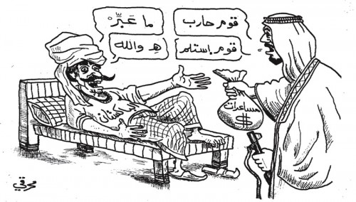 ويظهر في الكاريكاتير المنشور على صحيفة أخبار الخليج المقربة من رئيس الوزراء البحريني خليفة بن سلمان، صورة الملك السعودي سلمان بن عبدالعزيز وهو يمسك بكيس أموال في يد، وسلاح في اليد الأخرى، ويقدمهما لباكستاني مستلقٍ على فراش، وهو يخاطبه "قوم حارب" فيرد "ما عبر" أى لا أستطيع. فيقول له الشيخ "قوم استلم" أي تسلم الأموال، فيرد "هـ والله". الحوار يشير إلى طبيعة العلاقة التي تربط السعودية بباكستان حكومةً وشعباً إذ تقوم على إصدار الأوامر مقابل تقديم الأموال.