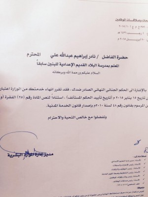 ونشر الناشط عبدالإمام صورة من رسالة الفصل الصادرة عن مدير إدارة الموارد البشرية في وزارة التربية والتعليم والمؤرخة بتاريخ أمس الإثنين 20 أبريل/نيسان 2015 وجاء فيها إنه "بالإشارة إلى الحكم الجنائي النهائي الصادر ضدك، فقد تقرر إنهاء خدمتك من الوزارة اعتباراً من تاريخ 15 يناير/كانون الثاني 2015 (تاريخ تأييد الحكم المستأنف)، استناداً لنص المادة رقم (25) الفقرة (و) من المرسوم بقانون رقم 48 لعام 2010 بإصدار قانون الخدمة المدنية".