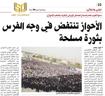 Bahrain Mirror: Saudi "Al-Yaum" newspaper in its issue published on Wednesday (April 22, 2015) posted a picture of a Bahraini opposition rally staged in the village of "Karana", claiming that it's a photo of a protest in Ahwaz area in southern Iran against what it described as "the Persian occupation".