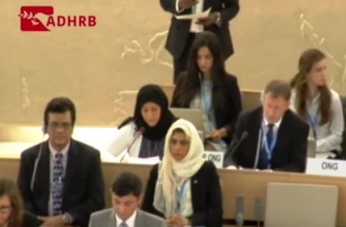 مرآة البحرين (خاص): ألقت أرملة الشهيد زكريا العشيري، حورية علي، كلمة في أولى جلسات الدورة الـ29 لمجلس حقوق الإنسان بالأمم المتحدة في جنيف اليوم الإثنين 15 يونيو/حزيران 2015، سردت فيها ما تعرّض له العشيري من تعذيب داخل السجون البحرينية، أدّى إلى استشهاده في أبريل/نيسان 2011.