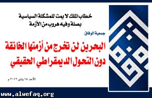 مرآة البحرين: قالت جمعية "الوفاق" إن خطاب ملك البحرين يوم الأحد "لا يمت إلى الأزمة السياسية بصلة"، معتبرة أن فيه "هروب من الأزمة التي تعصف بالبلاد منذ عشرة أشهر".