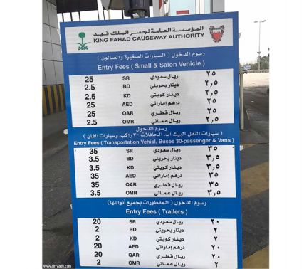 مرآة البحرين: أكد المتحدث الرسمي لمؤسسة جسر الملك فهد عماد المحيسن أن المؤسسة تبدأ غداً (الجمعة) التطبيق الجديد لرسوم الدخول للمركبات الصغيرة والكبيرة (بيك آب، صالون، حافلات 30 راكباً، سيارات مقطورة) على جسر الملك فهد حيث بدأت المؤسسة بوضع اللوحات التي تحدد الرسوم الجديدة في أماكن متفرقة على جسر الملك فهد.