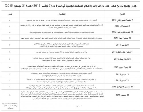 وأضافت الصحيفة إنه في (31 ديسمبر/ كانون الأول 2015)، أيدت محكمة الاستئناف العليا، حكم إعدام المتهم الأول والسجن المؤبد لـ 7 متهمين و10 سنوات لـ 4 متهمين وإسقاط جنسية جميع المتهمين البالغ عددهم (12) بقضية مقتل شرطي بالعكر بتاريخ 4 يوليو/ تموز 2014، فيما أصدرت المحكمة الكبرى الجنائية الرابعة في اليوم ذاته حكمها على 23 متهماً في قضية تأسيس جماعة إرهابية والانضمام إليها وقتل أحد أفراد الشرطة أثناء وبسبب تأديته لواجبه وقتل شخص مدني وأحداث تفجير واستعمال وحيازة المتفجرات والأسلحة تنفيذاً لأغراض إرهابية وجمع أموال لجماعة إرهابية والتجمهر والشغب وحيازة المولوتوف، بمعاقبة المتهمين بإعدام المتهم الأول وبالسجن المؤبد لباقي المتهمين عما أسند إليهم، كما حكمت بإسقاط الجنسية عن جميع المتهمين وتغريم المتهمين الثالث والرابع مبلغ 200 ألف دينار بحريني.