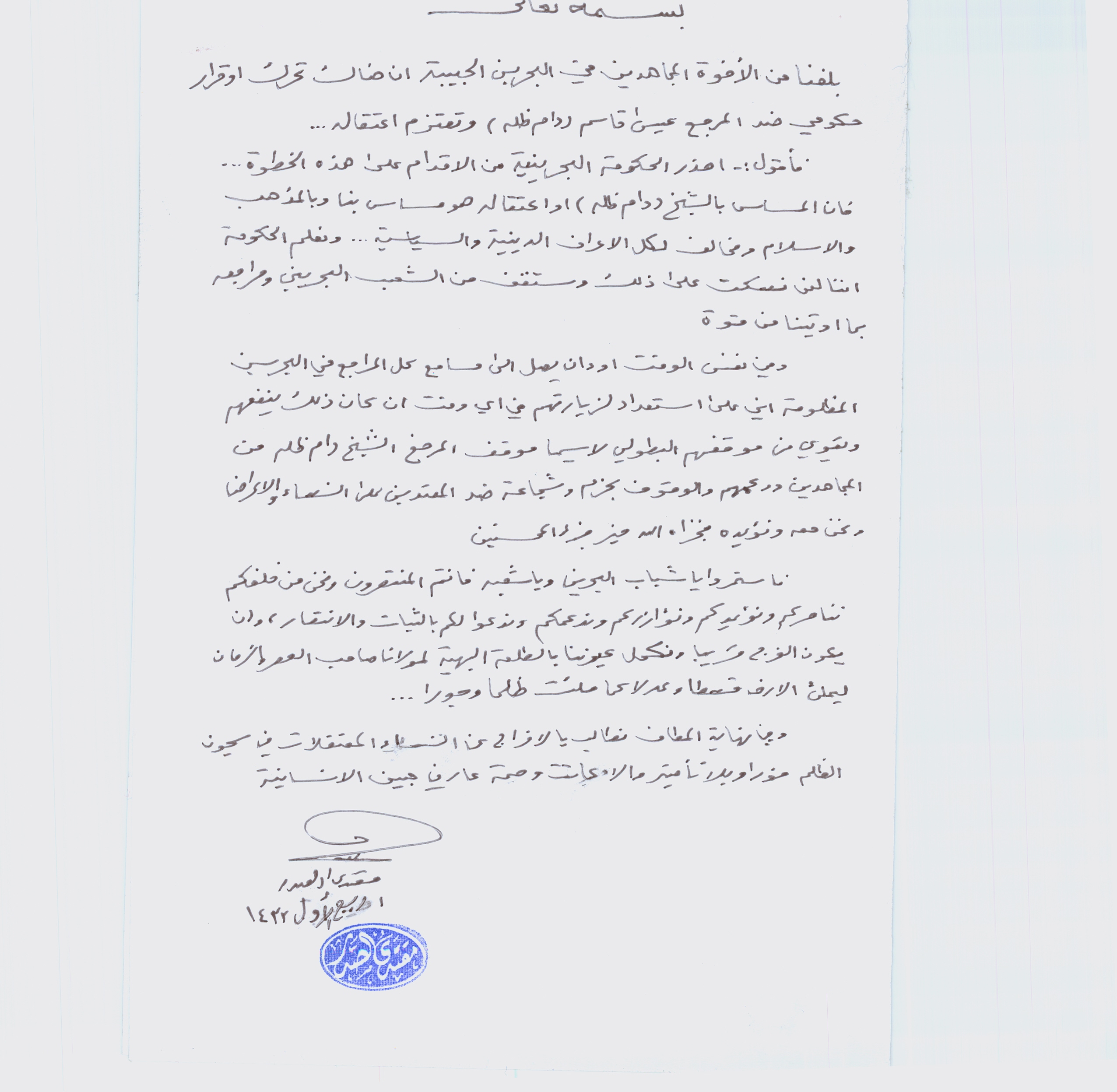 وجاء في البيان "بلغنا من الإخوة في البحرين أن هناك تحركاً أو قرارا حكومياً ضد المرجع عيسى قاسم وتعتزم اعتقاله". وأضاف "أحذر الحكومة البحرينية من هذه الخطوة فإن المساس بالشيخ أو اعتقاله، هو مساس بنا وبالمذهب والإسلام ومخالف لكل الأعراف الدينية والسياسية" على حد ما جاء في البيان.