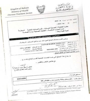 وقالت العائلة: «إنه بعد عودتهم من سنغافورة وبعد أن فارقت زينب الحياة في المستشفى أثناء العلاج تفاجأوا بعد عودتهم بمخاطبة وزارة الصحة لهم، وذلك لتسديد مبلغ وقدره 2253 ديناراً، على أن يرجع هذا المبلغ إلى بند الخدمات لقسم العلاج بالخارج» حسب ما قالت صحيفة الوسط.