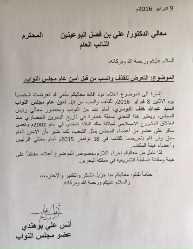 مرآة البحرين: تقدم نائب بحريني (الثلاثاء 9 فبراير/ شباط 2016) بشكوى لدى النيابة العامة ضد أمين عام المجلس عبدالله الدوسري بتهمة السب والقذف.النائب أنس بوهندي خاطب النائب العام علي فضل البوعينين، متهما الدوسري بشتمه بحضور رئيس المجلس أحمد الملا ونواب آخرين، لافتا إلى أنها المرة الثانية التي يتعرض فيها الدوسري إليه.