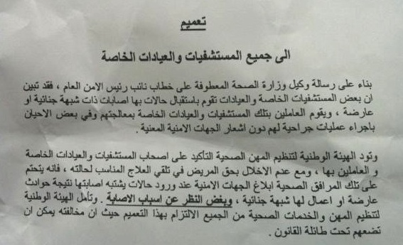 ويتابع الرئيس التنفيذي في تعميمه "تود الهيئة الوطنية لتنظيم المهن الصحية التأكيد على أصحاب المستشفيات والعيادات الخاصة والعاملين بها (...) فإنه يتحتم على تلك المرافق الصحية إبلاغ الجهات الأمنية عند ورود حالات يشتبه إصابتها نتيجة حوادث عارضة أو أعمال لها شبهة جنائية، وبغض النظر عن أسباب الإصابة". وهدد بأن من يخالف التوصية الواردة في التعميم ب"وضعهم تحت طائلة القانون".