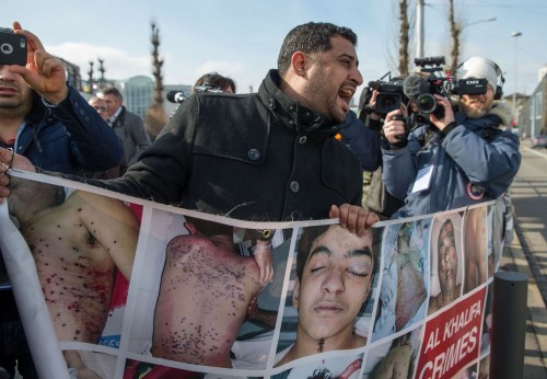 ويسعى المعتصمون إلى تسليط الضوء على مسئوليته عن انتهاكات بحق عشرات الرياضيين في بلاده حصلت خلال احتجاجات الربيع العربي في العام 2011.