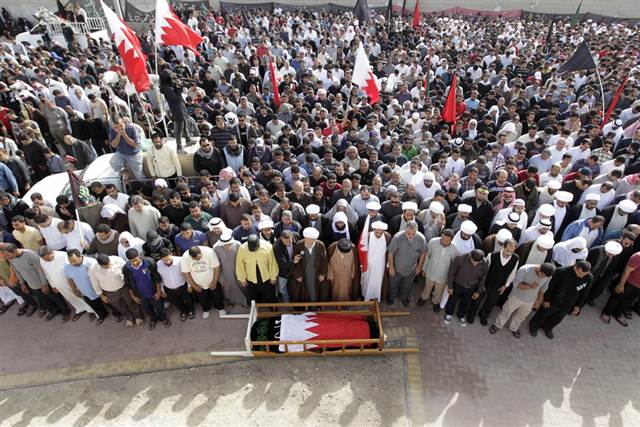 في جزيرة سترة، وهي معقل للاحتجاجات الشيعية، مزيد من المتظاهرين بدأوا يرتدون أكفانا بيضاء ترمز إلى استعدادهم للموت. "إنها حرب بين الديكتاتورية والديمقراطية"، يزمجر محمد علي 29 عاما، وهو أحد المتظاهرين.