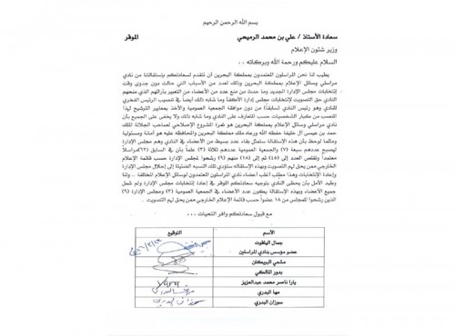 مرآة البحرين: قالت صحيفة الأيام المملوكة لمستشار الملك الإعلامي نبيل الحمر، إن عدداً من المراسلين الصحفيين المعتمدين في البحرين الأعضاء في مجلس إدارة نادي مراسلي وسائل الإعلام الأجنبية، رفعوا عريضة استقالات لوزير شؤون الإعلام في خطوة تمهد لحل مجلس الإدارة، وهو الأمر الذي يطالبون به بحسب العريضة.