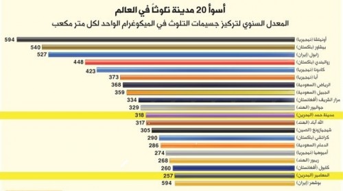 وبيّن التقرير الذي نشرت جانباً منه صحيفة الوسط المحلية، أن المعدل السنوي لتركيز جسيمات التلوث في الميكوغرام الواحد لكل متر مكعب، إذ جاءت مدينة حمد في المركز الحادي عشر بمعدل 318، فيما جاءت المعامير في المركز التاسع عشر بمعدل 257.