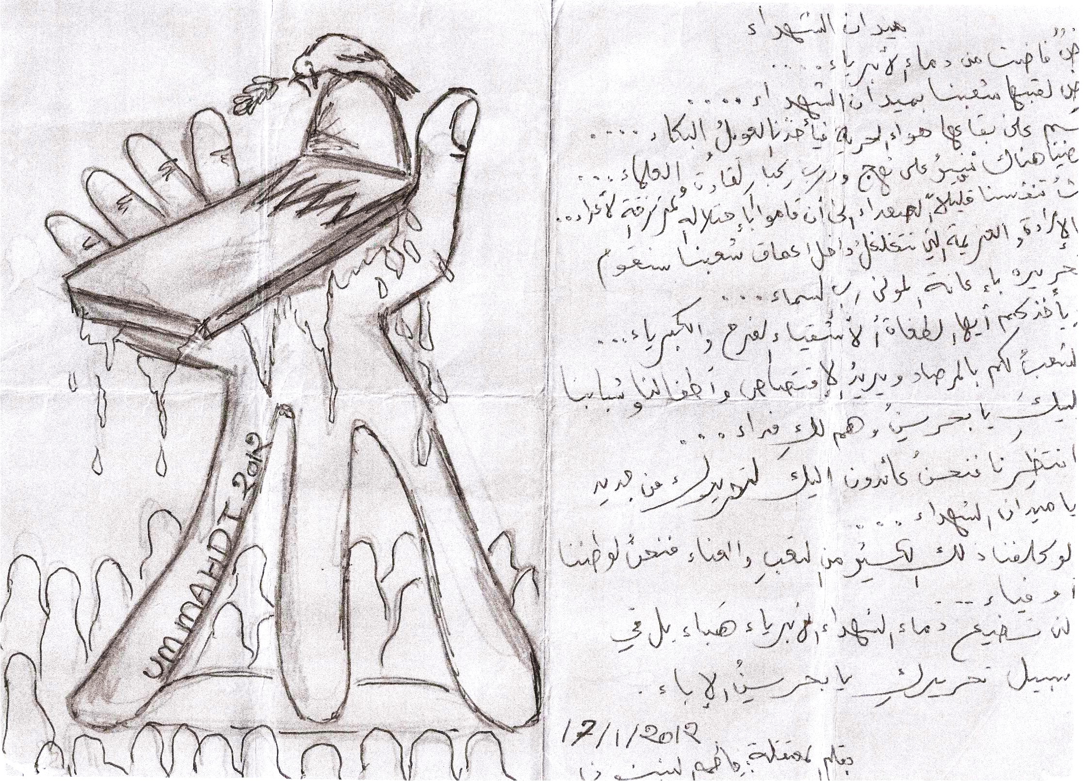 "أصدقائي، سامحوني لأنكم تجاهدون في ساحات القرية ليلياً ضدّ المرتزقة، أما أنا فقد صرتُ هنا في السجن، أدعو الله أن يفكّ أسري لأكون معكم" (حسين، 23 ديسمبر 2011، الحوض الجاف).