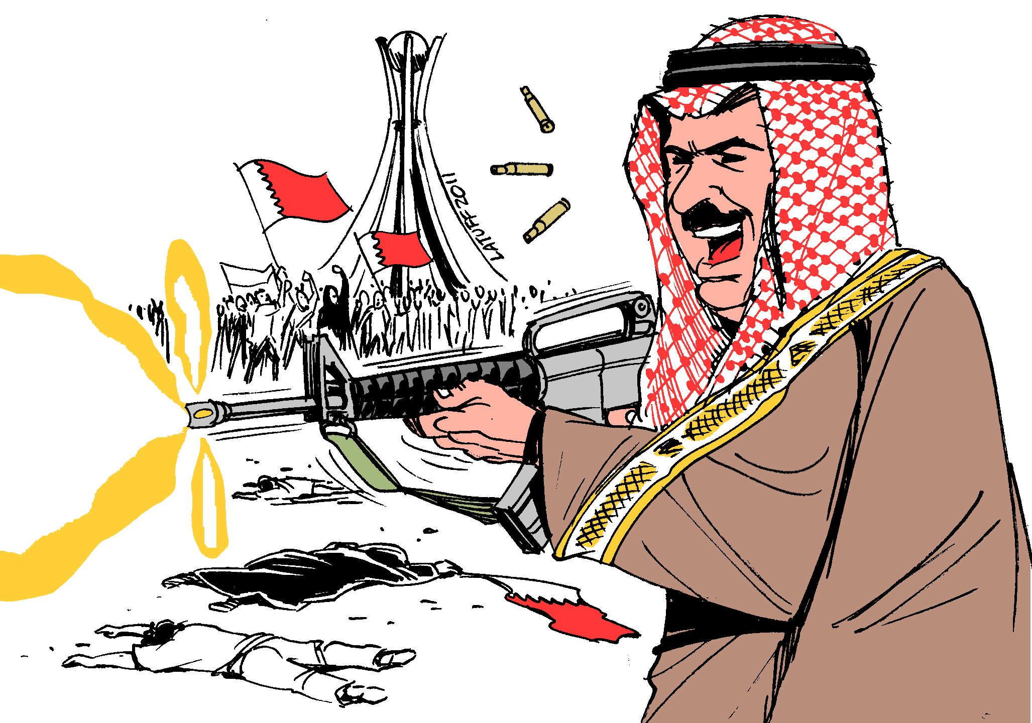 حين مر صديقي (الذي هاجر من البحرين خوفا من قمع قواتك المرتزقة) بالبقعة التي سقطت فيها دماء الشهيد عبد الرضا بو حميد قرب دوار اللؤلؤة، انحنى عليها مقبّلا. دخلنا دوار اللؤلؤة لكن جيوش قبيلتك الغازية اغتالت حراكنا السلمي، واستباحت قرانا، وهتكت حرمة بيوتنا، واعتقلت حريتنا. لقد حاصرتنا جنود عرشك لكننا لم نخضع.