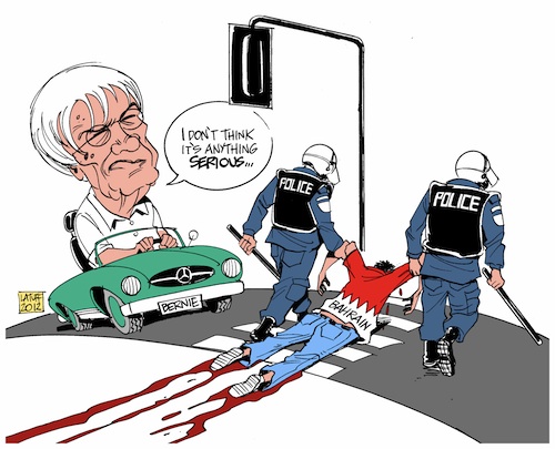 يأتي ذلك متماهيا مع رغبة مالك حقوق سباق الفورمولا1 بيرني ايكلستون الذي سخر من المتظاهرين البحرينيين ووصفهم بمجموعة كبيرة من الأطفال، خلال تصريح أدلى به لصحيفة الجارديان البريطانية، نافيا أن يتواصل إيقاف السباق كما حدث في السنة الماضية بسبب الاضطرابات السياسية التي اندلعت في 14 فبراير 2011.