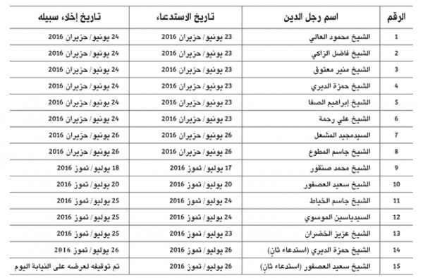 وأوضحت "بدأت سلسلة الاستدعاءات الأمنية إلى رجال الدين في (23 يونيو/حزيران 2016)، حيث استدعت السلطات الأمنية إلى مركز شرطة البديع 6 رجال دين هم: الشيخ محمود العالي، الشيخ فاضل الزاكي، الشيخ منير معتوق، الشيخ حمزة الديري، والشيخ إبراهيم الصفا، الشيخ علي رحمة، بالإضافة إلى المنشدَين: جعفر القشمعي ومهدي سهوان، وذلك بسبب مشاركتهم في اعتصام الدراز، غير أنها قامت بالإفراج عنهم في اليوم التالي (24 يونيو 2016)".