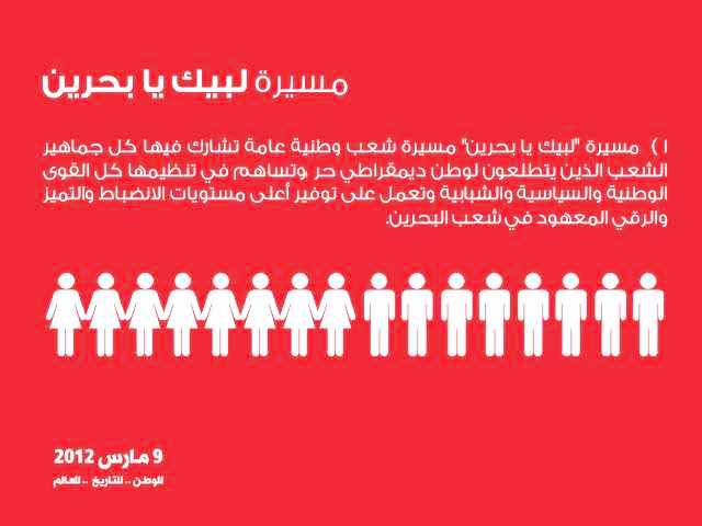 وشددت اللجنة على ضرورة حمل أعلام البحرين "التي تعكس عمق ارتباطنا براية الوطن وليس راية أوطان أخرى"، لافتة إلى أن مسيرة "لبيك يا بحرين" تشكل مفصلاً من مفاصل حراك الشعب البحريني من أجل نيل الحرية والديمقراطية ونيل الحقوق، نظراً إلى ما حازت عليه من دعوة ودعم نوعي واستنفار شعبي، ما يستلزم اهتماماً وعناية يحقق التميّز والانضباط العالي والرقي المطلوب الملائم لمستوى الدعوة ووعي الشعب".