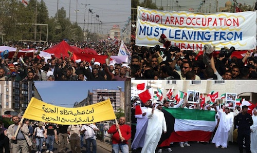 وقالت الفرنسية إن المتظاهرين رددوا هتافات بينها "البحرين حرة حرة درع الجزيرة بره" مطالبين بخروج القوات السعودية من البلاد بعدما يقارب العام من دخولها، ورفع المتظاهرون لافتات كتب عليها "أين كان الجيش السعودي من جرائم الاحتلال في غزة".