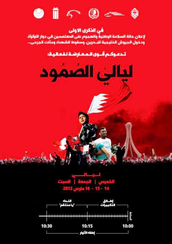 مرآة البحرين: دعت الجمعيات السياسية أنصارها إلى إطلاق التكبيرات وإطفاء الأنوار في الذكرى السنوية لإعلان حالة السلامة الوطنية والهجوم "الثاني" على المعتصمين في دوار اللؤلؤة ودخول قوات درع الجزيرة التي تصادف أيام الخميس والجمعة والسبت المقبلة.