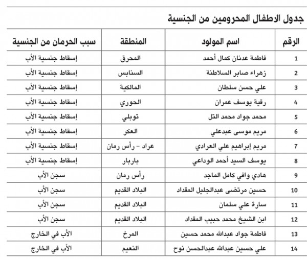 وختمت "فيما منع طفلان من الحصول على الجنسية؛ بسبب وجود أبويهما خارج البلاد لأسباب سياسية وأمنية وهما: فاطمة جواد عبدالله محمد حسين من منطقة المرخ، وعلي حسين عبدالله عبدالحسن نوح من منطقة النعيم".