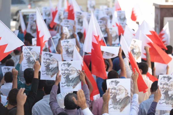 ورفع المتظاهرون صوراً للزعيم الروحي للغالبية الشيعية آية الله الشيخ عيسى قاسم وجنبها صورة الشهيد علي عباس، الذي استشهد قبل سنوات أثناء توجهه للصلاة خلف قاسم بالدراز، مرددين شعارات متضامنة مع قاسم.