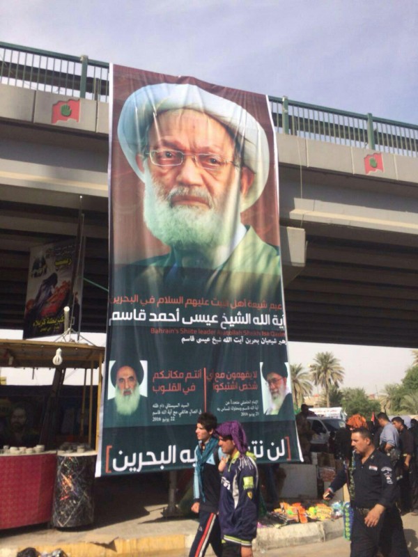 وعلى الطريق بين النجف وكربلاء، علّقت لافتات ضخمة تحمل صور الشيخ عيسى قاسم، الزعيم الديني الأعلى في البحرين، الذي أسقطت السلطات جنسيته في يونيو/حزيران 2016، مثيرة موجة جديدة من الاحتجاجات.