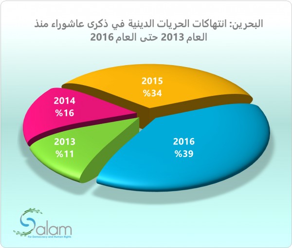 ووفق المنظمة فإن السلطات كانت قد أقدمت على "(57) انتهاكاً خلال العام 2013، و(79) انتهاكاً في العام 2014، و(169) انتهاكات في العام 2015، بينما سجًّل العام 2016 الموجة الأعلى بواقع (199) انتهاكاً، الأمر الذي يؤكد ما استنتجته المنظمة سابقاً من أن انتهاكات الحريات الدينية تسير بوقْعٍ منهجي من قِبل السلطات البحرينية".