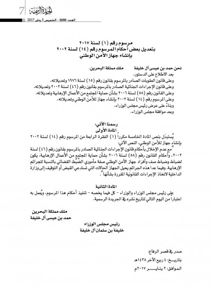مرآة البحرين: أصدر ملك البحرين حمد بن عيسى آل خليفة، أول مرسوم للعام 2017، والذي أعطى فيه الصلاحية لجهاز الأمن الوطني بتوقيف الأفراد، وهو ما يعرف بـ "صفة الضبط القضائي".