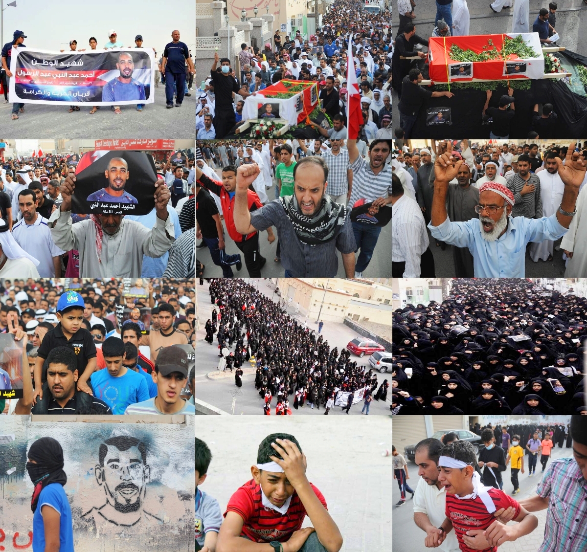 من جانبها، نعت جمعية الوفاق الوطني الإسلامية "الشهيد أحمد عبدالنبي من منطقة شهركان الذي قضى بالغازات القاتلة التي تستخدمها السلطة في البحرين".