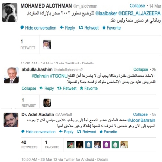 ويظهر حساب العثمان آخر تغريدة له قبل حوالي 19 ساعة، وهي تتحدث عن فشل البحرينيين في خيار التعايش، قائلاً "لقد فشلنا، ونقطة على السطر". كما يظهر حسابه أيضاً إشارات تتقمص ببعض "مصطلحات" المعارضة مثل وصفه دستور 2002 بأنه "منحة"؛ إذ يقول في رده على أحد المتدخلين "للتوضيح دستور 2002 صدر بإرادة منفردة. وبالتالي هو دستور منحة وليس عقداً" على ما جاء في إحدى تغريداته. في حين لوحظ اختفاء عموده من صحيفة "البلاد" منذ فترة.