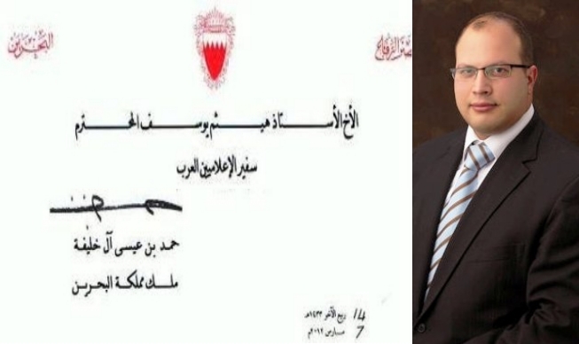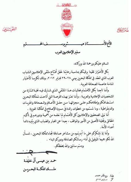مرآة البحرين (خاص): حصلت "مرآة البحرين" على رسالة بعثها الملك حمد بن عيسى آل خليفة إلى "رئيس الإعلاميين العرب الشباب" الأردني، هيثم يوسف، في إطار الجهود التي تقوم بها السلطة لحث وشراء أقلام صحفية لتلميع صورتها.