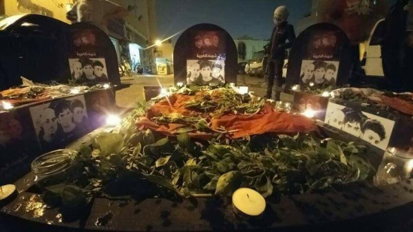 ورفع المتظاهرون صور الشهداء، ورددوا شعارات مناوئة لملك البحرين حمد بن عيسى آل خليفة، الذي حمّلوه مسؤولية مقتلهم، وإعدام 3 آخرين منتصف يناير/ كانون الثاني الماضي.