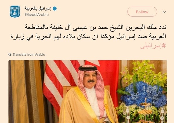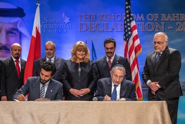 في وقت سابق من العام الحالي، زار زعيمان من مركز شيمون فيزنتال، ومركزه في لوس أنجلوس، البحرين، وعقدا لقاء مع الملك حمد بن عيسى آل خليفة. ووفقًا للحاخامين، ندّد الملك العربي بالمقاطعة العربية الطويلة الأمد لإسرائيل، وقال إنه من الممكن للمواطنين [البحرينيين] زيارة إسرائيل.