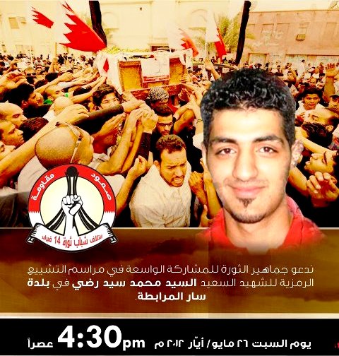 مرآة البحرين (خاص): دعا "ائتلاف شباب ثورة 14 فبراير" جماهير الثورة إلى المشاركة في مراسم التشييع الرمزية للشهيد محمد سيد رضي، وذلك عصر يوم غدٍ السبت في بلدة سار منْ أمام المسجد الوسطي.