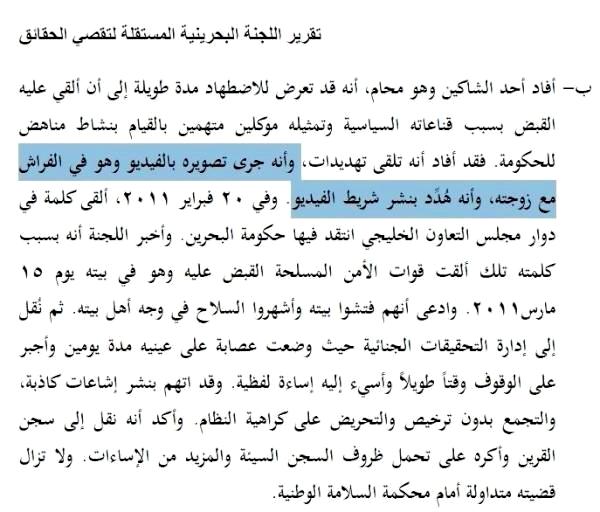 مرآة البحرين: جاء في الفقرة 1261 من تقرير لجنة تقصي الحقائق الذي صدر في 23 نوفمبر/تشرين الثاني 2011، إن أحد الشاكين وهو محام (المعني به محمد التاجر) قد أفاد أنه قدتعرض للاضطهاد مدة طويلة إلى أن ألقي عليه القبض بسبب قناعاته السياسية وتمثيله موكلين متهمين بالقيام بنشاط مناهض للحكومة.
