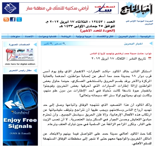 مرآة البحرين (خاص): يدور جدل كبير في أوساط الشارع الموالي للنظام حول حادثة مقتل مواطن يدعى أحمد الظفيري، توفي في المستشفى بالأردن يوم أمس. وفي حين لم تعلن الحكومة أسباب مقتله ولم تعلق على ما يتداول في الشارع، أصدر ائتلاف للجمعيات الموالية بيانا نعى فيه الظفيري وقال إنه "استشهد بسبب قنبلة مزروعة وسط إطارات محروقة زرعها مخربون" حسب تعبيره، وكذلك نعى رئيس جمعة الإصلاح القتيل وقال "إنه استشهد بسبب محاولته إنقاذ المارة على الطريق" على حد قوله.