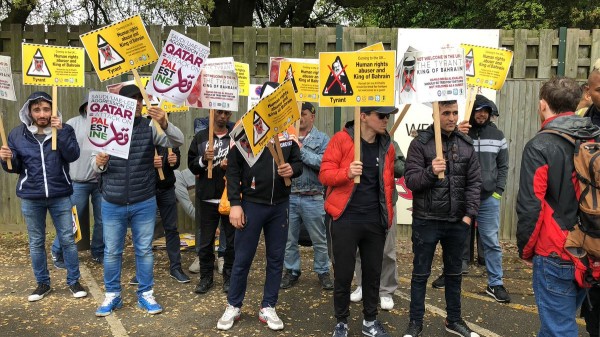 وقالت المنظمة إن المحتجين بعثوا برسالة تضامن لهؤلاء الذين يناضلون من أجل حقوق الإنسان والديمقراطية في البحرين، ورفع المتظاهرون لافتات كبيرة كتب عليها شعارات من قبيل «أوقفوا تسليح القمع في البحرين» و«ملك البحرين الطاغية غير مرحب به في المملكة المتحدة» وكذلك «حمد بن عيسى يجب أن يحاكم بسبب التعذيب لا أن يرحب به كضيف» .