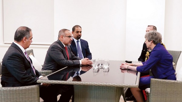 مرآة البحرين: التقى ولي عهد البحرين سلمان بن حمد آل خليفة، رئيسة وزراء بريطانيا تيريزا ماي، وذلك خلال زيارته المملكة المتحدة للحضور كضيف شرف في مراسم تسليم المقر الجديد لمركز الدفاع والتأهيل الوطني.