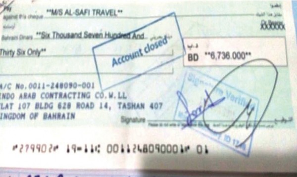 مرآة البحرين: فرّ أصحاب شركة إنشاءات من البحرين بعد أن خدعوا حوالي 40 شركة بمئات آلاف الدنانير عبر إعطائهم «شيكات» بدون رصيد، وذلك بحسب ما أورد موقع صحيفة «ديلي تريبيون»  البحرينية الناطقة بالإنجليزية.