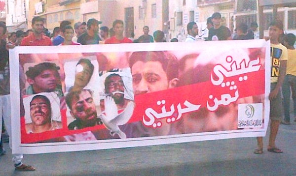 تجمع ما يقرب من 250 شخص في الشارع في سترة، البحرين. نصفهم تقريبا كانوا من الرجال والفتيان، البعض كان يرتدي ثوبا متدفقا أبيض، والبعض الآخر على النمط الغربي يرتدي الجينز والقمصان. النساء والفتيات كن يشكلن النصف الآخر، في الغالب (وليس حصرا) كن يرتدين العباءة السوداء التقليدية والحجاب. وكان للعديد من الرجال والنساء والأطفال عين واحدة مغطاة بالشاش (الضمادة) ، مثبتة بشريط لاصق جراحي. هذا الاحتجاج كان نيابة عن أولئك الذين فقدوا عين - أو كلتا العينين – بسبب الرصاص المطاطي والشوزن والقنابل الغازية التي تطلقها شرطة مكافحة الشغب مباشرة على الوجوه والقسم العلوي من اجساد المتظاهرين. وقال النشطاء الذين أخذوني إلى المظاهرة أن ما يقرب من 100 متظاهر فقدوا إحدى أعينيهم منذ اندلاع الثورة منذ ستة عشر شهرا، وهو عدد احتاج للتأكد منه.