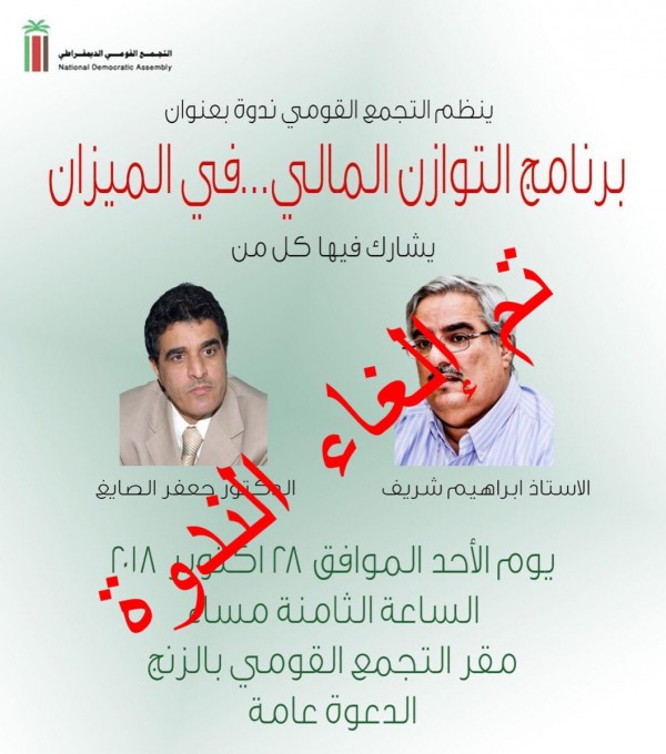 وقد وزّع بعض النشطاء رسالة نصية وصلت إلى هواتفهم اليوم الأحد 28 أكتوبر 2018، مفادها : «تعلن الأمانة العامة للتجمع القومي عن إلغاء ندوة الليلة حول برنامج التوازن المالي بسبب طلب وزارة العدل في اتصال هاتفي بالأمين العام للتجمع بإلغاء مشاركة الأستاذ إبراهيم شريف في الندوة».