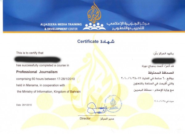 ــ صورة الشهادات التي وزعت على المشاركين في سلسلة ورش أقامتها "قناة الجزيرة" بمقرّ وزارة الإعلام البحرينية