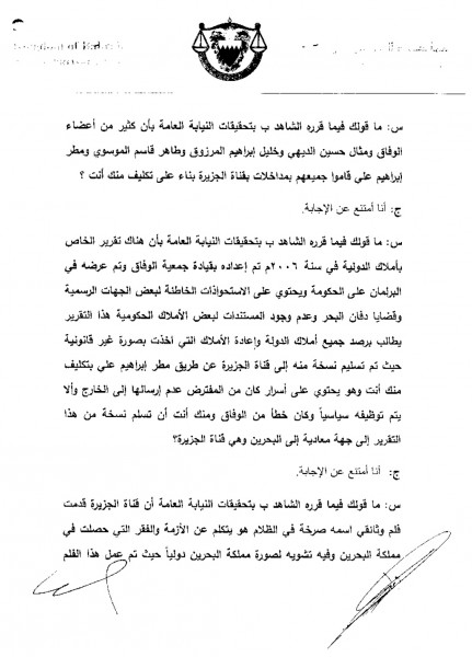"س: ما قولك فيما قرره الشاهد بأنّ التقرير الخاص بأملاك الدولة الذي تم إعداده بقيادة جمعية الوفاق وتم عرضه في البرلمان على الحكومة في 2006 (...) تم تسليم نسخة من إلى قناة الجزيرة عن طريق مطر إبراهيم علي بتكليف منك أنت وهو يحتوي على أسرار كان من المفترض عدم إرسالها إلى الخارج؟