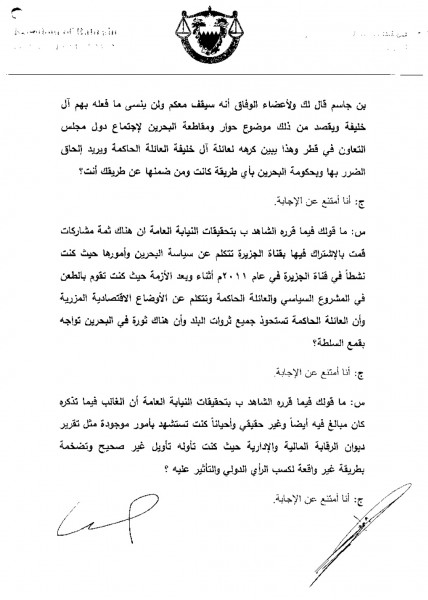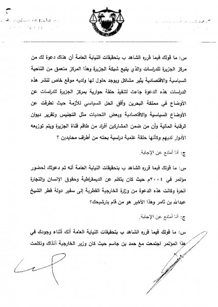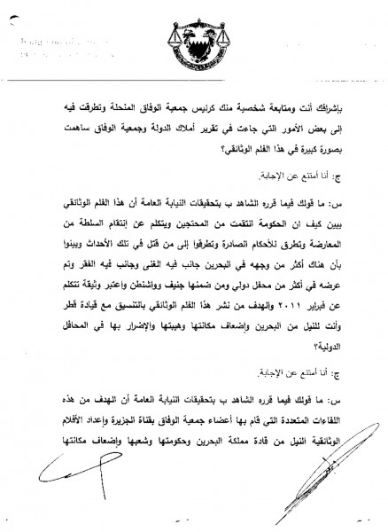 هذه عيّنة طبق الأصْل قمنا بتفريغها من التحقيقات الطّويلة التي استغرقت ساعات طوال على عدّة جلسات مع زعيم المعارضة البحرينيّة وإجاباته على الأسئلة والتي امتنع إزاءها جميعاً عن التعليق أو الإجابة لتهافتها وضآلة معدّّها (الصور في الأسفل). التّهمة هي: "قناة الجزيرة".