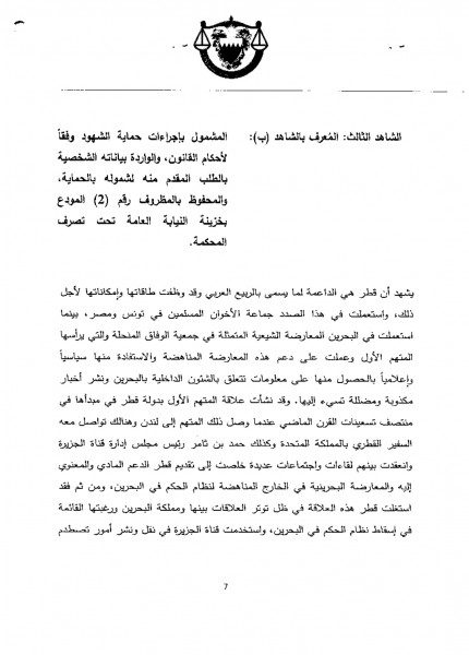 وهكذا الأمر أيضاً مع الضابط عبدالله فهد العربي (29 سنة) الذي شهد بأن "المتهم تولى تسهيل ظهور الأشخاص الذين يحددهم المتهم الأول من الموالين له في قناة الجزيرة للإساءة إلى نظام الحكم في البحرين ومحاولة تأجيج الشارع البحريني والعمل على تغطية أحداث 2011 إعلاميا بتعمد إظهار تعرض المعارضة للاضطهاد والقمع".