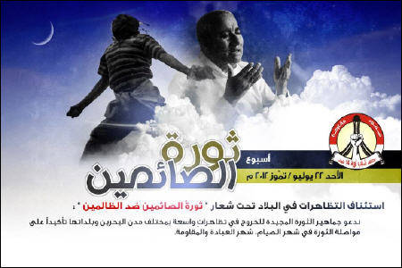 وقد أشارت صحيفة "الوفاق" الايرانية الناطقة باللغة العربية إلى أن إئتلاف شباب الرابع عشر من فبراير في البحرين دعا الى استئناف التظاهرات في مختلف المدن والبلدات تحت شعار ثورة الصائمين ضد الظالمين. وقال الائتلاف على موقع التواصل الاجتماعي الفايس بوك:" ندعو جماهير الثورة المجيدة للخروج في تظاهراتٍ واسعة بمختلف مدن البحرين وبلداتها تأكيداً على مواصلة الثورة في شهر الصيام، شهر العبادة والمقاومة".