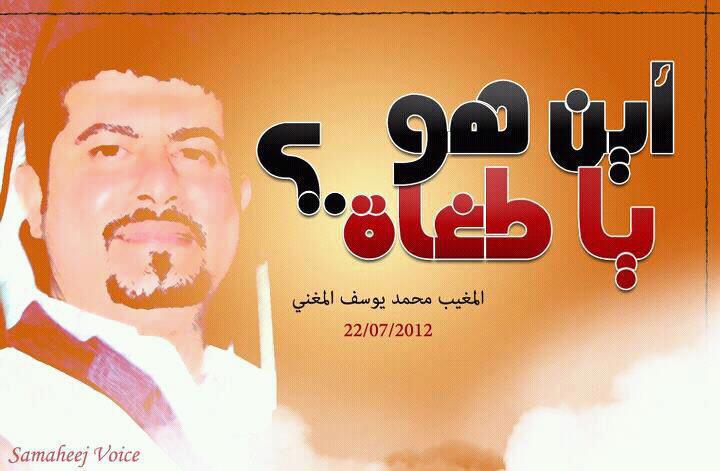 محمد يوسف المغني اعتقل من المطار بعد عودته مع عائلته من إيران، ومنذ ذلك الحين اختفت أخباره، تمت مداهمة منزله عدة مرات وتم مصادرة ملابسه وأحذيته، إضافة إلى لابتوبه، كما تمت مصادرة ثلاث سيارات لإخوته. ورغم مراجعة العائلة لمراكز الشرطة، ومقار وزارة الداخلية إلا أنها نفت وجوده معتقلاً عندها، لتأتي أخبار غير مؤكدة تقول إن محمد المغني استشهد تحت التعذيب، وأن الداخلية تعد بياناً لفبركة أسباب وفاته كما هي عادتها.